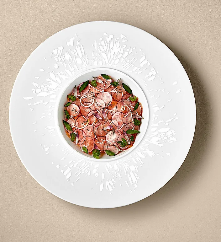 Προορισμένο για εστιατόρια υψηλής ποιότητας που είναι ευαίσθητοποιημένα στην εποχικότητα των φρούτων και λαχανικών, βιολογικών και τοπικών, το μοτίβο Citrus είναι εμπνευσμένο από κομμάτια πορτοκαλιού και λεπτές φέτες. Μέσα από την υποτιθέμενη ασυμμετρία του, εκφράζει την αυθεντικότητα και την αρχοντιά της φυσικής ατέλειας.